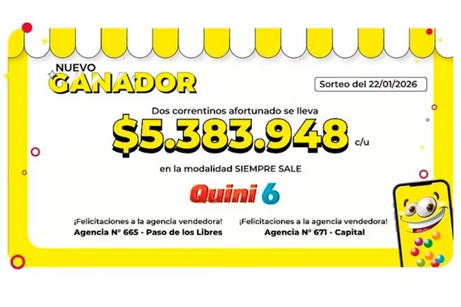 El sorteo de anoche del Quini 6 dejó nuevos ganadores en la provincia de Corrientes. Dos apostadores resultaron favorecidos en la modalidad Siempre Sale, obteniendo $5.383.948 cada uno.